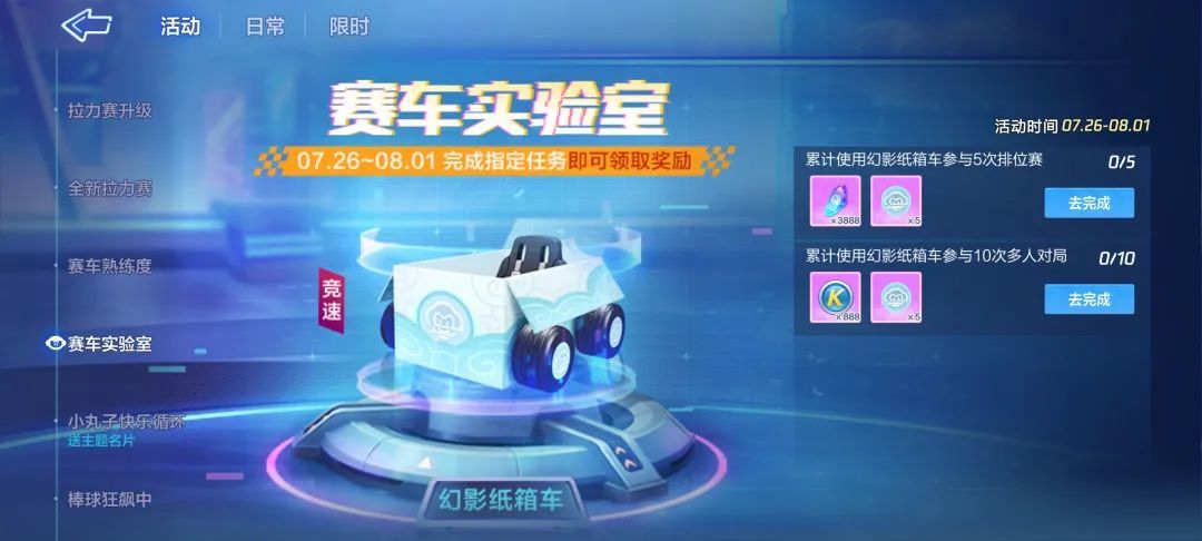体验幻影纸箱车完成活动任务,还可领取专属车贴等珍稀奖励!