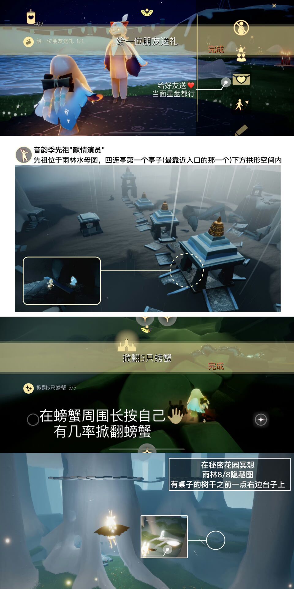 《光遇》游戏中每天的每日任务及大蜡烛的位置都不相同,玩家完成每日任务及收集大蜡烛都可以得到丰厚的兑换奖励,奖励可以用于兑换各种动作及道具,不过很多小伙伴不知道每日任务怎么做,又懒得自己去找大蜡烛的位置,我们汇总了每日任务的完成攻略以及蜡烛位置,一起来看看吧!