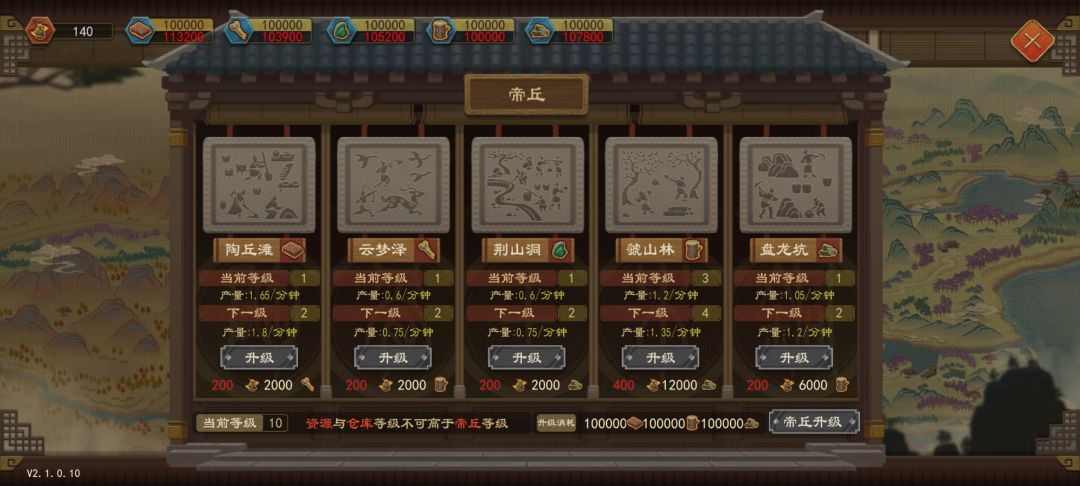 帝丘(与主界面无关),帝丘升级之后才能升仓库,云梦泽等需要遗尘的升级是产量