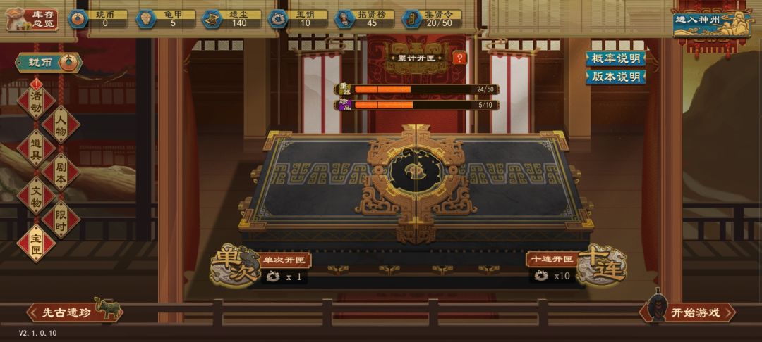宝匣就是抽卡,不过抽出来的是文物以及材料