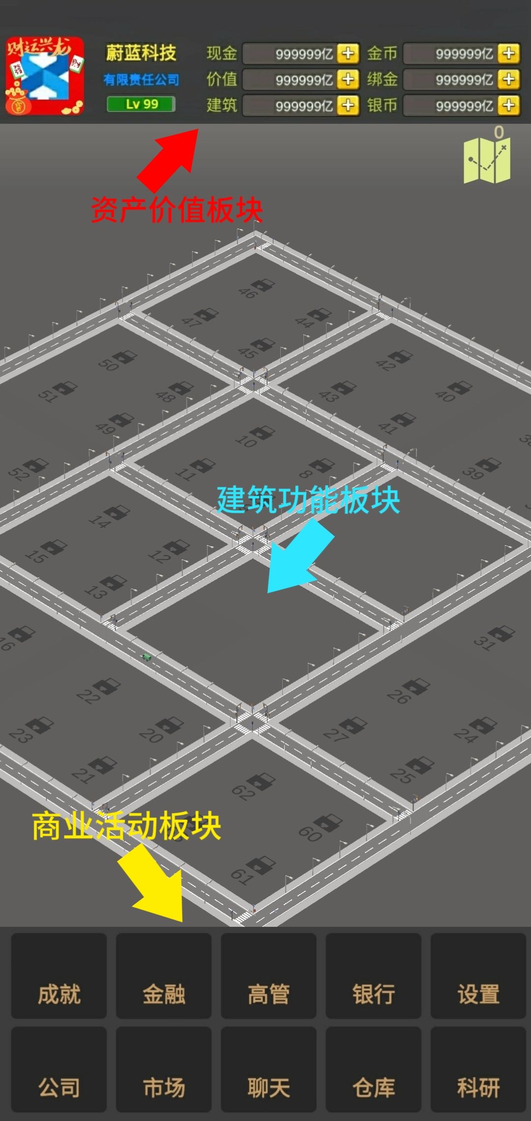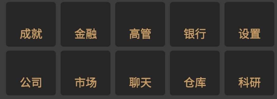 游戏的主界面分为三大板块,从上到下依次是资产价值板块,建筑功能板块,商业活动板块