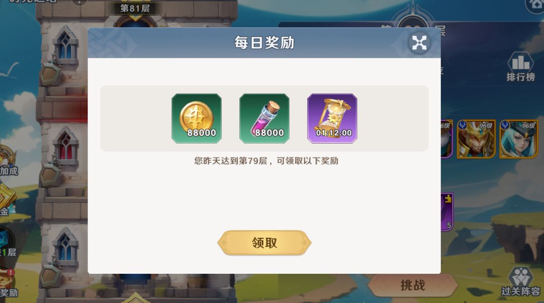 :每日可领取一次,奖励依据昨日通关最高层数为基准领取,越高则奖励越丰厚,每日凌晨5点刷新