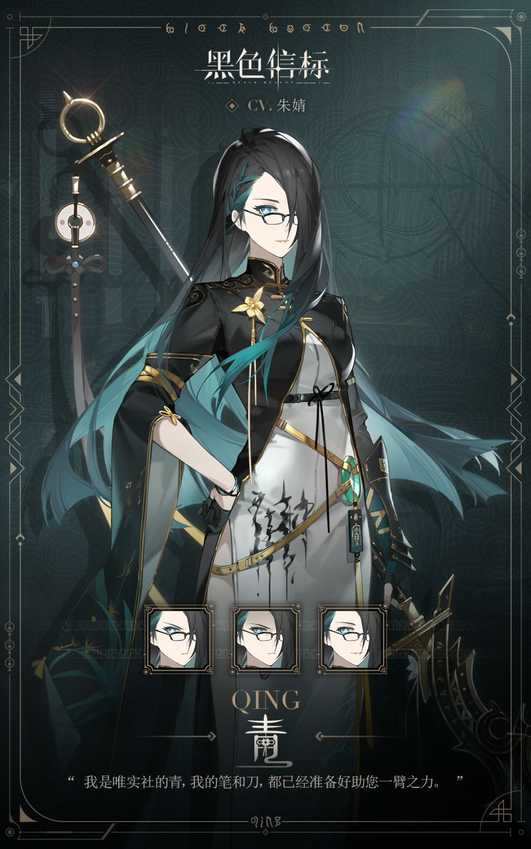 青,仓廪台明镜司的执镜。默默承受着繁重工作的巨大压力,并将这一切谨慎地收纳在文雅温和的形象背后,然而一旦工作受阻,便会转为寒冬般的凌厉,如明镜般照亮一切同僚心中可能藏污纳垢的角落。下班后——如果偶尔能按时下班的话——会到广场上与老人们比试地书,一人高的巨大毛笔被她挥舞自如。一旦唯实社召唤,她手中的笔锋便会变为同样沉重锐利的刀锋。