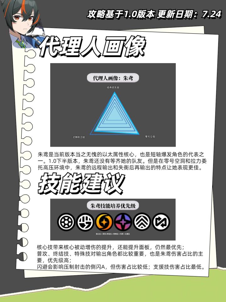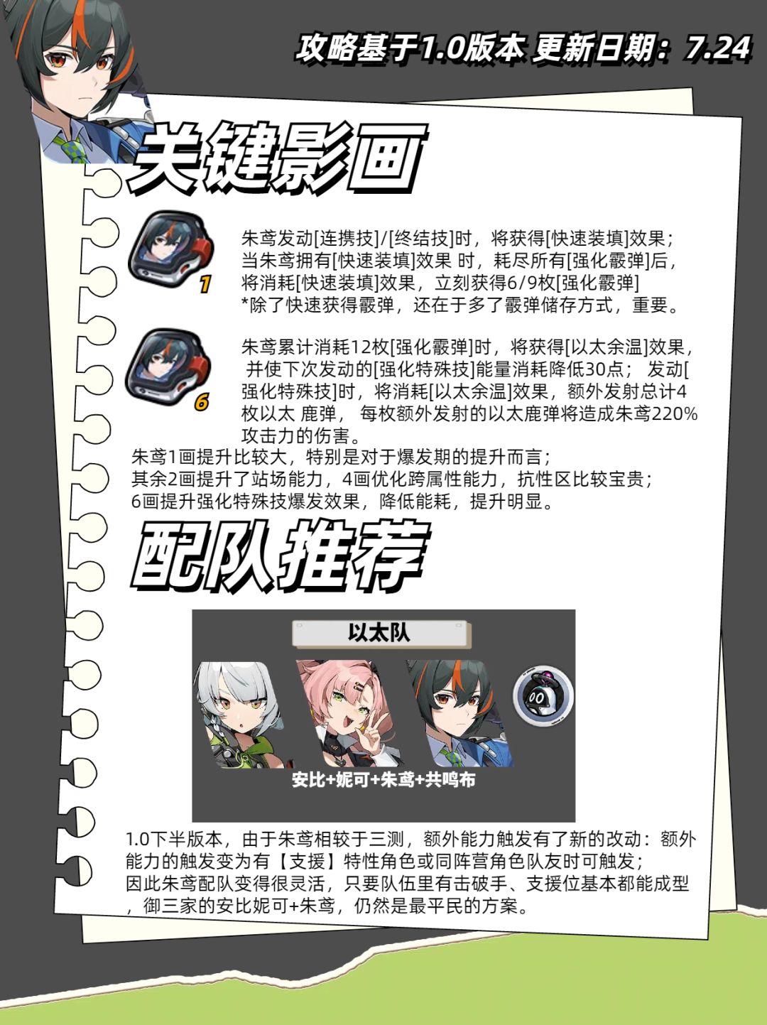 朱鸢是当前及未来较长一段时间内,唯一的以太强攻特性角色。配合当前尚可的以太弱点环境,朱鸢在各场景中的伤害表现都还不错。