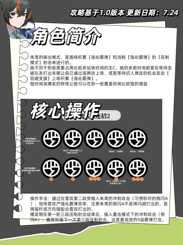 操作小提示:朱鸢的压制射击是远程攻击,朱鸢的一些动作有后撤步或者向后腾空的动作。但和其他远程角色类似,朱鸢离敌方太远的话也会受到距离伤害衰减的惩罚。爆发前可以通过冲刺攻击等方式接近敌方,不要离开敌方大概两个冲刺的距离输出。