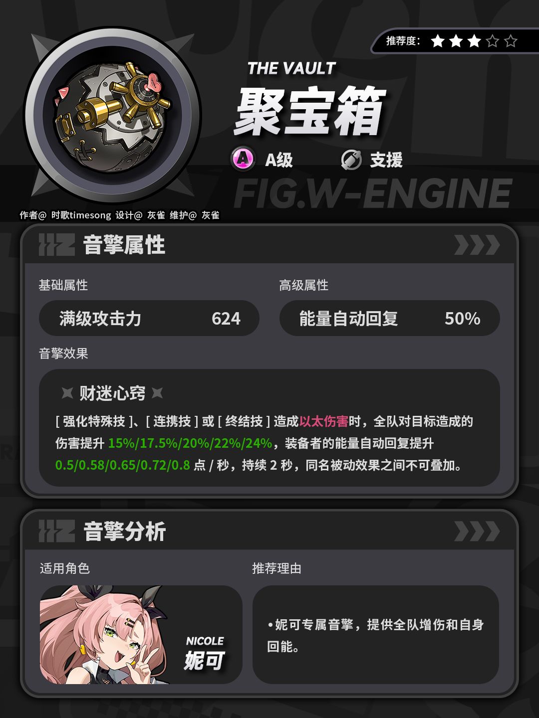 聚宝箱是妮可的A级专武,其能量回复属性能让妮可更加频繁地释放强化特殊技,提高整体的减防覆盖率。