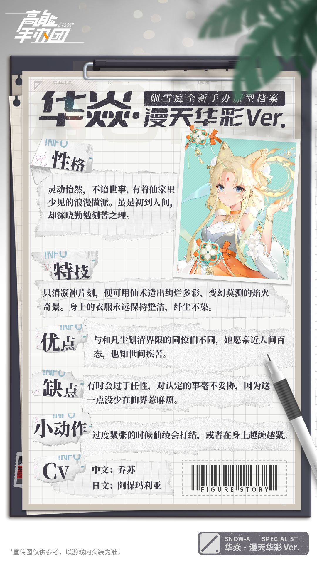 在《高能手办团》时空交错的微缩世界里,联动手办“华焱”化身豫州游艺的年轻焰火师,因表演的焰火瑰丽绚烂而成名,却鲜有人知晓她的真实身份——位列仙班的天火仙子。因痴迷名为「打铁花」的古老技艺,仙子私自化形,擅闯人间。