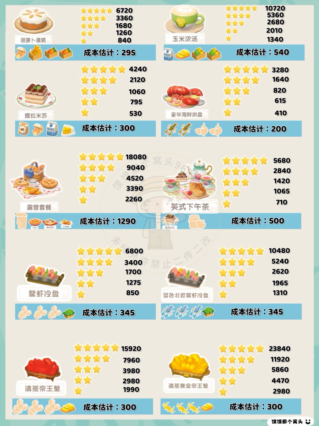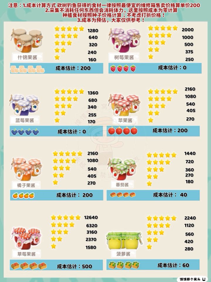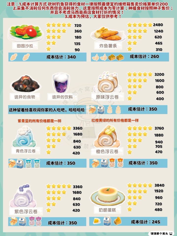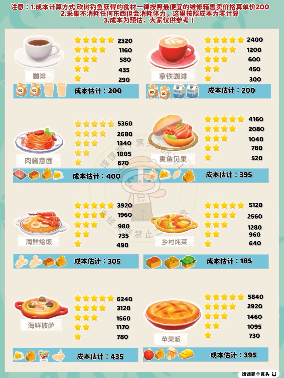 注意:1.砍树钓鱼食材,一律按照单价200(最便宜的维修盒售价)