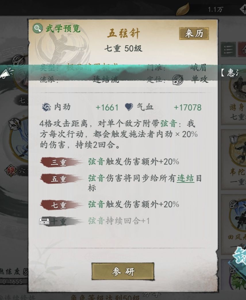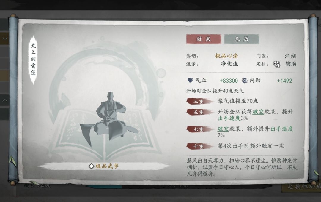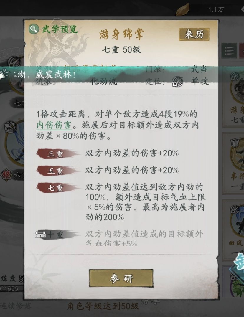 效果:我方随从包括自己,每次行动都可以触发主角最高60%内劲给单个敌方造成伤害=60%内劲x4人x3回合=理想伤害是720%主角内劲伤害