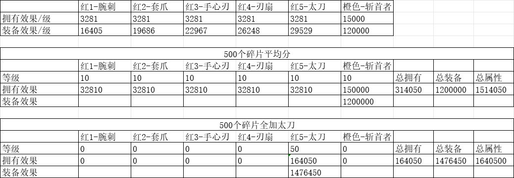 假设有400红武器碎片,平均升,就是5件10级红+1件10级橙色,表格计算可知,总属性加成1514050%;