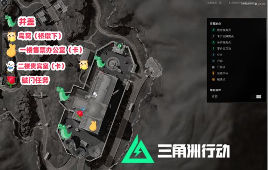 游客中心点位有3个井盖彩蛋点,一楼和二楼各有一处密钥房(需要对应房卡),一楼有一处破门任务点,在外围玻璃桥下,桥墩中间有一个鸟窝彩蛋点。这些地方有较高概率爆出较高价值的物品。此外,游客中心的小房子里还有极高概率会刷新各种饮料,偶尔会出现“咖啡”。