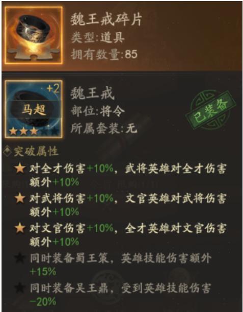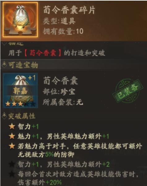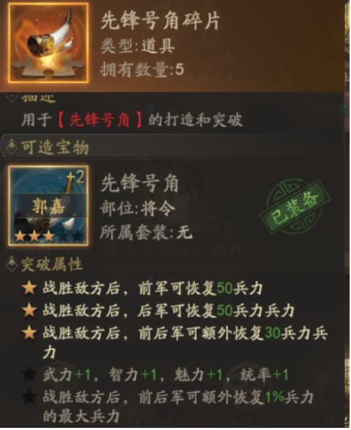 除了活动可以弄到的装备碎片,前期还会有一些散件装备搭配武将也是比较厉害适配的,比如荀令香囊、先锋号交、踏云乌骓、蜀王策、魏王戒等。