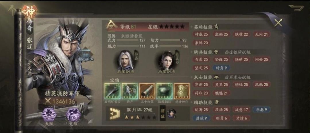 神威我又换回来了,去掉了象阵,S4的张辽输出进一步匮乏,象阵远战防御技能太多导致象阵打不出什么伤害,不稳定的控制也导致发挥的作用很小,神威刚好契合刀剑录的属性,不过没想到象阵换成神威还掉了三万战力,心疼了。