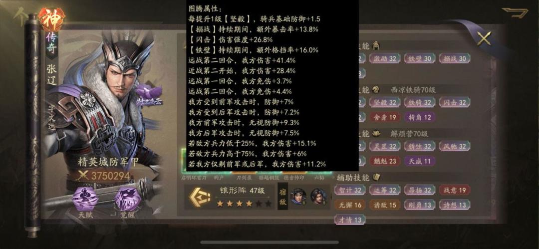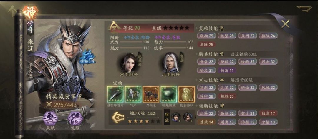 张辽需要高四维,他的闪击需要武力和魅力都高才能打出最高伤害,同时统帅也要超过对方,让昂扬的高级效果得到释放,智力配合智计同样不可或缺