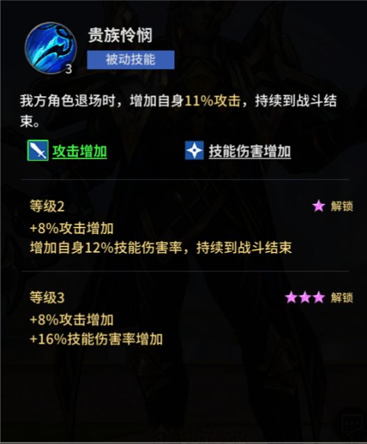 效果:我方角色退场时,增加自身11%攻击,持续到战斗结束。
