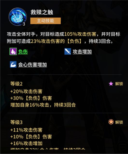 效果:攻击全体对手,对目标造成105%攻击伤害,并对目标附加可造成23%攻击伤害的【负伤】,持续3回合。