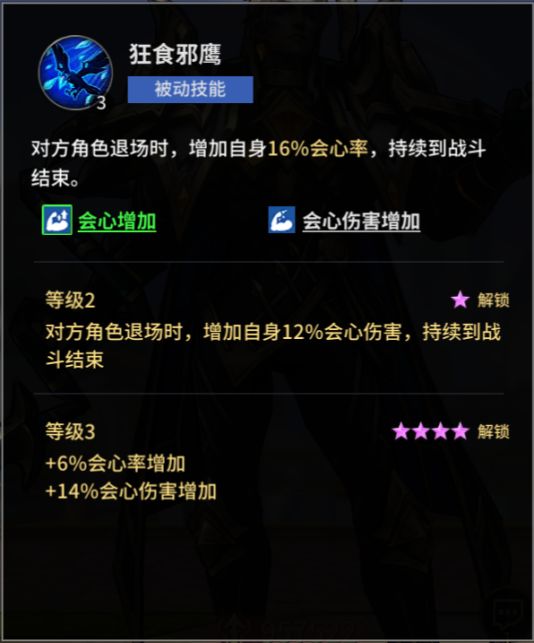 效果:对方角色退场时,增加自身16%会心率,持续到战斗结束。