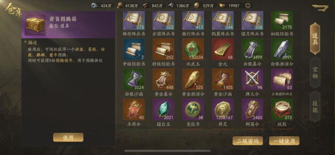 S3元宝终于可以腾出来使用了,兵法也可以开始抽取,不过我目前仍旧没有拉满,武力达到六级、智力五级、魅力两级、统帅三级,骁骑21级、英魂20级、暴击26级、痛击20级。