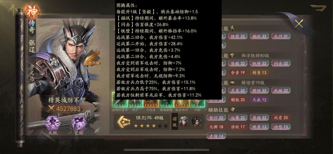 S3开启了图腾系统,图腾不要过分要求紫色和橙色,以词条适配为主,没有的话不如用蓝色,就像我到现在还是蓝色,选择适配自己的图腾很重要,比如我是张辽,那么我就要强化前军破防、远二伤害和闪击伤害,倘若没有这三项的话,不管图腾多么鲜艳我都是不会选择的,这里给大家展示一下我的词条。