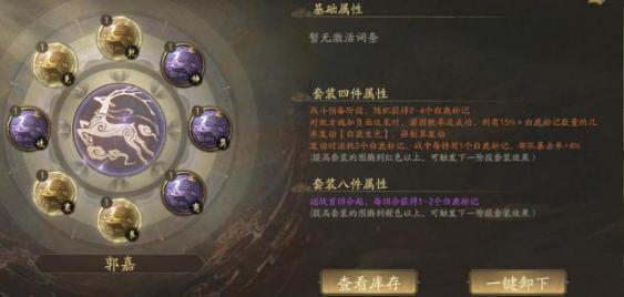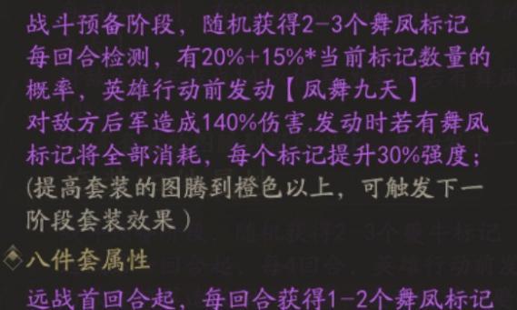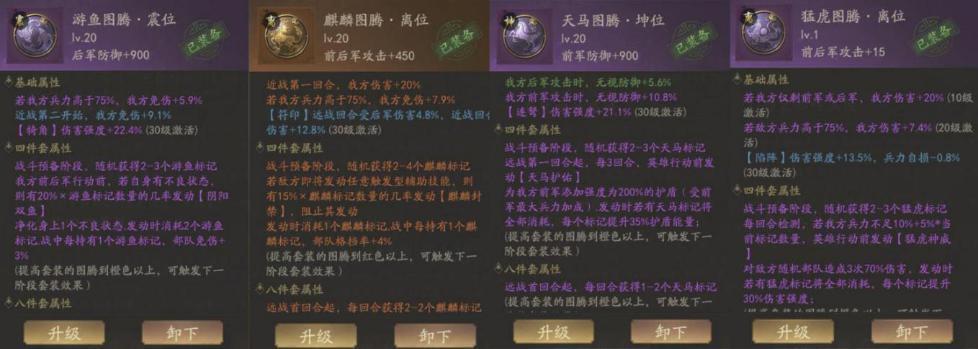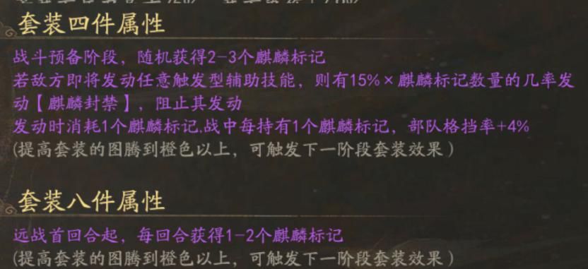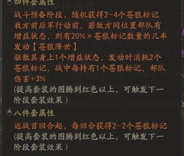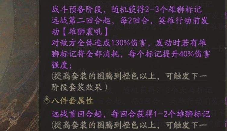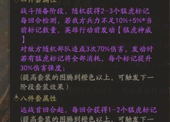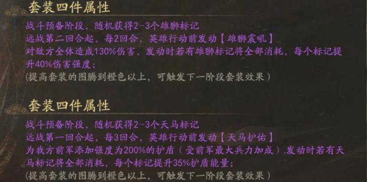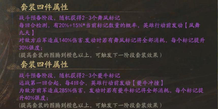 麒麟,舞凤,游鱼,白鹿,苍狼,战斗开始时随机获得几个标记,后面就不给了,一场战斗可能就是在远战回合,放出来一两次图腾效果,远战回合打伤害的英雄,利用2个四件套打伤害还是挺好的。