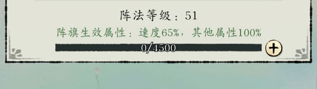 首先记得看左上角问号介绍。其次阵旗51级就是100%效果。后面再升就是120%、150%这样了,所以如果有能力,天源堂每天5次炼制符可以买(有能力才买)。