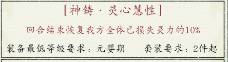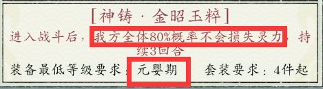 金昭玉粹(4件为一套):也就是锁灵,这个必须要有,没有这个,你就等着被别人越几千万乱杀吧,这个只用神铸,别用琉璃,因为这个有且只有一个颜色,就是红色,这代表即使是元婴锁灵就够了,给工具人伙伴装备上,后面洗出高境界锁灵再一件一件换。因为锁灵只有一个颜色,所以就算是俩件元婴、俩件大乘也是成套的,(炼装备可以转攻略一,洞府篇,炼器)。