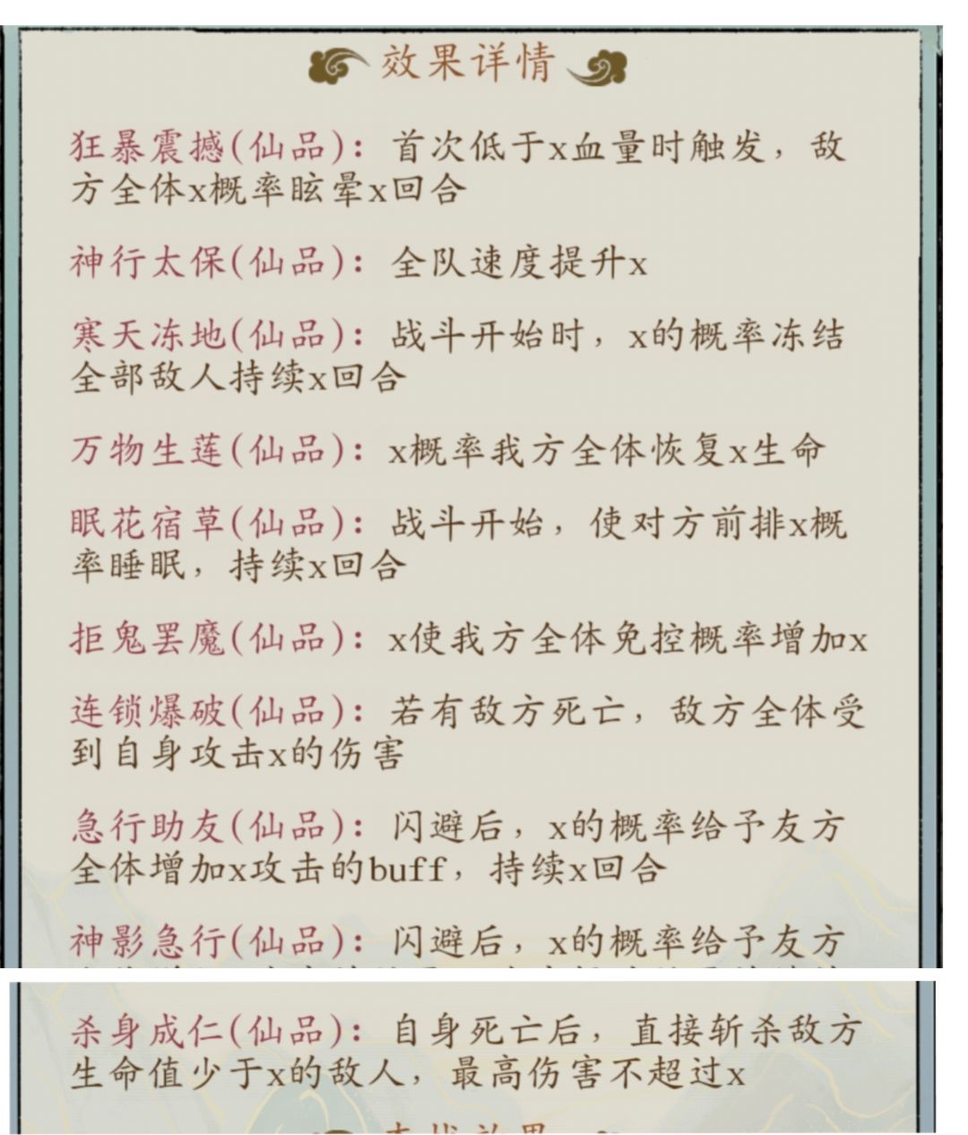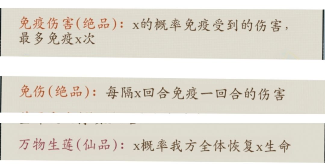 ⑥其他词条:万物生莲(高颜色估计有30%概率恢复30%以上生命)、免伤、免疫伤害:这几个属于有点用,但是相比其他作用有没那么大,比如万物生莲这个恢复,给工具人带,但是打架工具人被秒也触发不了,反而打业障、天妖、天魔这些有点小用。至于剩下其他词条,看个人理解。