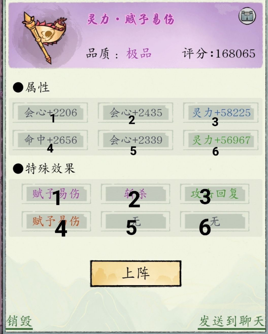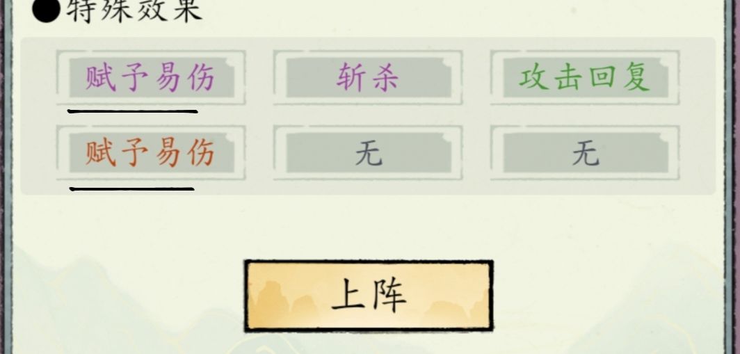 主角只有放2号位,才能有斩杀效果,放1号则是赋予易伤效果,放5,6号则什么都没有。这就是有些小伙伴明明上了阵旗却没有效果的原因,至于词条位置,可以上阵之后,可以根据自己阵容排列,花点灵石重置关键词条的位置。