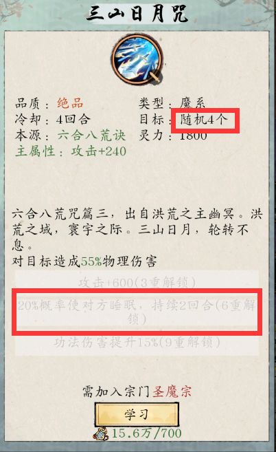 一技能,随机4个,20%概率使目标25%睡眠(3星20%睡眠)