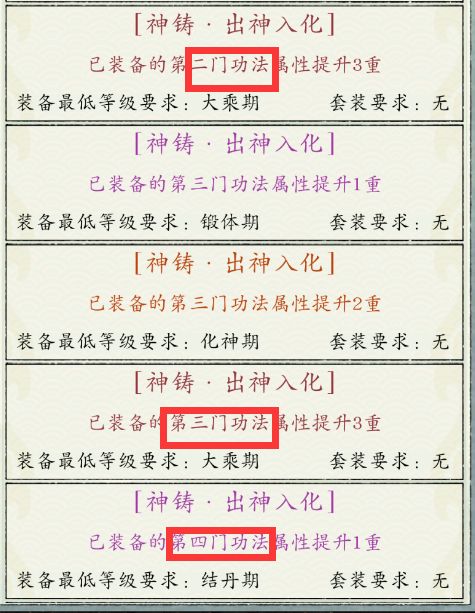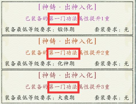 出神入化(第*门功法加层数):这个可以有,其他重加层数也挺好的,能把攻击拉很高很高,大乘攻击90万100万都不是梦。