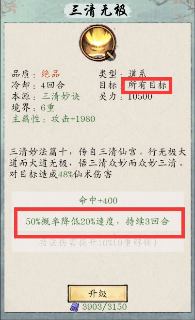 三技能,所有目标,50%概率降低目标25%速度(3星20%速度)