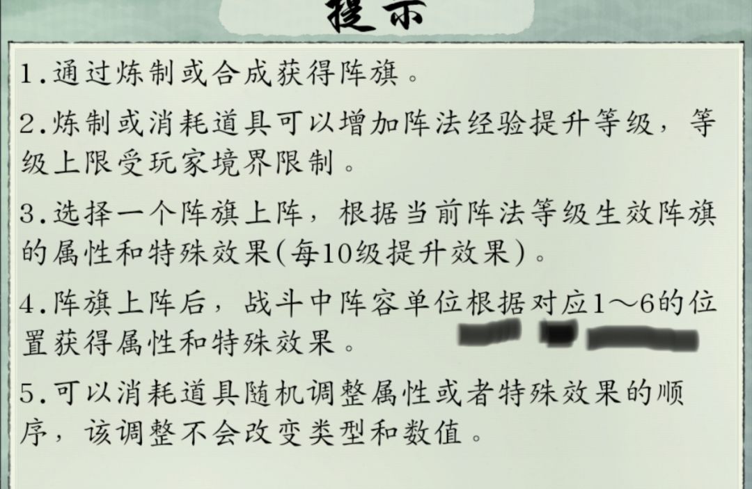炼制阵旗还处于初步探索阶段,配方需要多问大佬和自行探索,我上述这些也不一定准确,但是可行性挺高,具体很多其他搭配需要后续等待大佬们的探索。