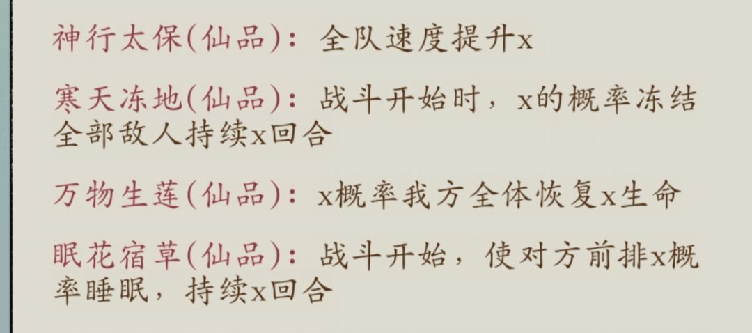 ③神行太保(高颜色应该有20%多加成)、寒天冻地(高颜色估计有30%概率)、眠花宿草(高颜色估计有30%概率):           首先,神行太保不用多说,这游戏速度很重要,其次寒天和眠花开局控制,和观星阁的先击一样,很容易打出奇效,寒天加眠花加先击,把把控对面6个不是梦。