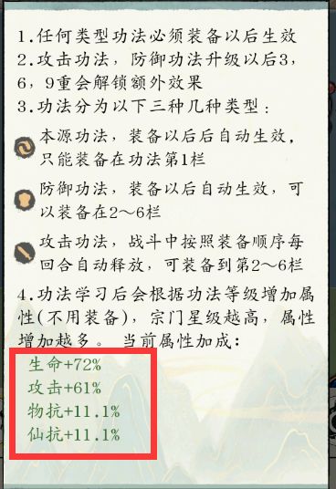举例来说,比如2星宗门第二层,第一个攻击技能点满(需要9400心得)加0.9%攻击,三星宗门第一层,第一个攻击点满(需要13600心得),加1.8%攻击,多4200心得,属性却翻倍,自己选吧。(当然,氪佬除外,氪佬没必要这么麻烦,挨着点满就行)