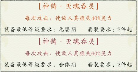灭魂吞灵(2件为一套):建议要有,前期有条件的话,主角一套,道侣一人一套,道侣用琉璃的也行。后期大家都有锁灵之后,道侣吞灵就可有可无,但是主角还是尽量要有,万一20%概率让你中了呢?这是能越几千万的关键。