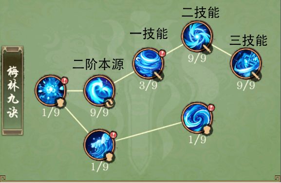 一技能尽量带增益技能,比如梅骨雪胎或者九幽魔息,剩下技能全部带三技能群攻(4星宗门,每个宗门第三攻击技能都是群攻技能)