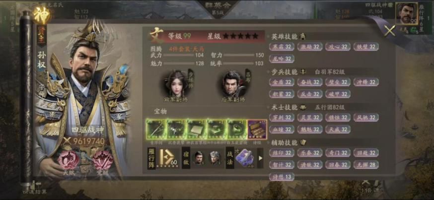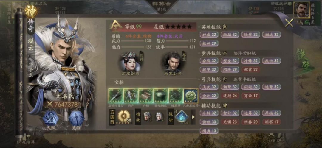 神赵云,764万战力,强21的云昭套装。副将刘禅+邓艾,图腾雄狮+天马,高级技能有枪神、陷阵、 积蓄、连射、穿云、洞察、回春、无懈等,但技能都不是满级。战法两蓝一绿。