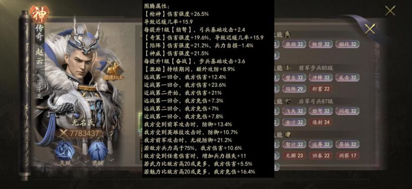 6、赵云的图腾,大家可以参考这个图腾属性,除了技能的加成外有几个重点给大家标出:前军无视防御、近战第一回合免伤。