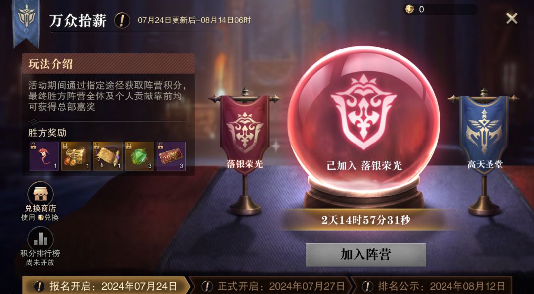 【比拼期】:2024年7月27日6时-2024年8月12日6时,期间通过四种主要途径(达标任务、单人讨伐、阵营竞速、超值消费)获取薪火勋章,为所在阵营增加积分。