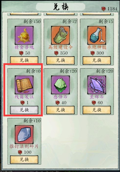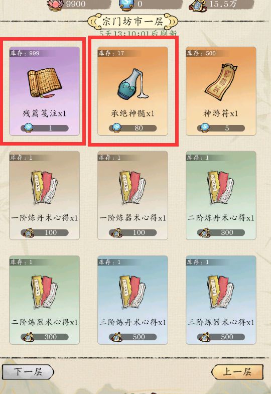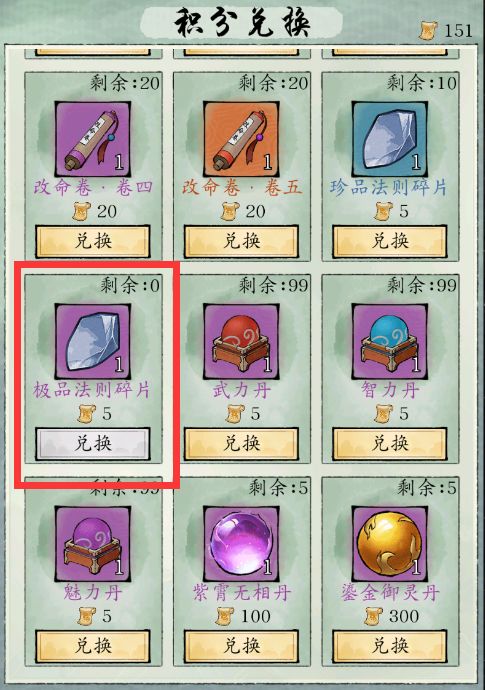 因为这里每次几乎固定有1个神髓产出,而且偶尔节日活动也有神髓,所以还差最后50个左右的神髓的时候,就不用在宗门商店换了,宗门商店全换残篇(宗门商店转上面查看)。