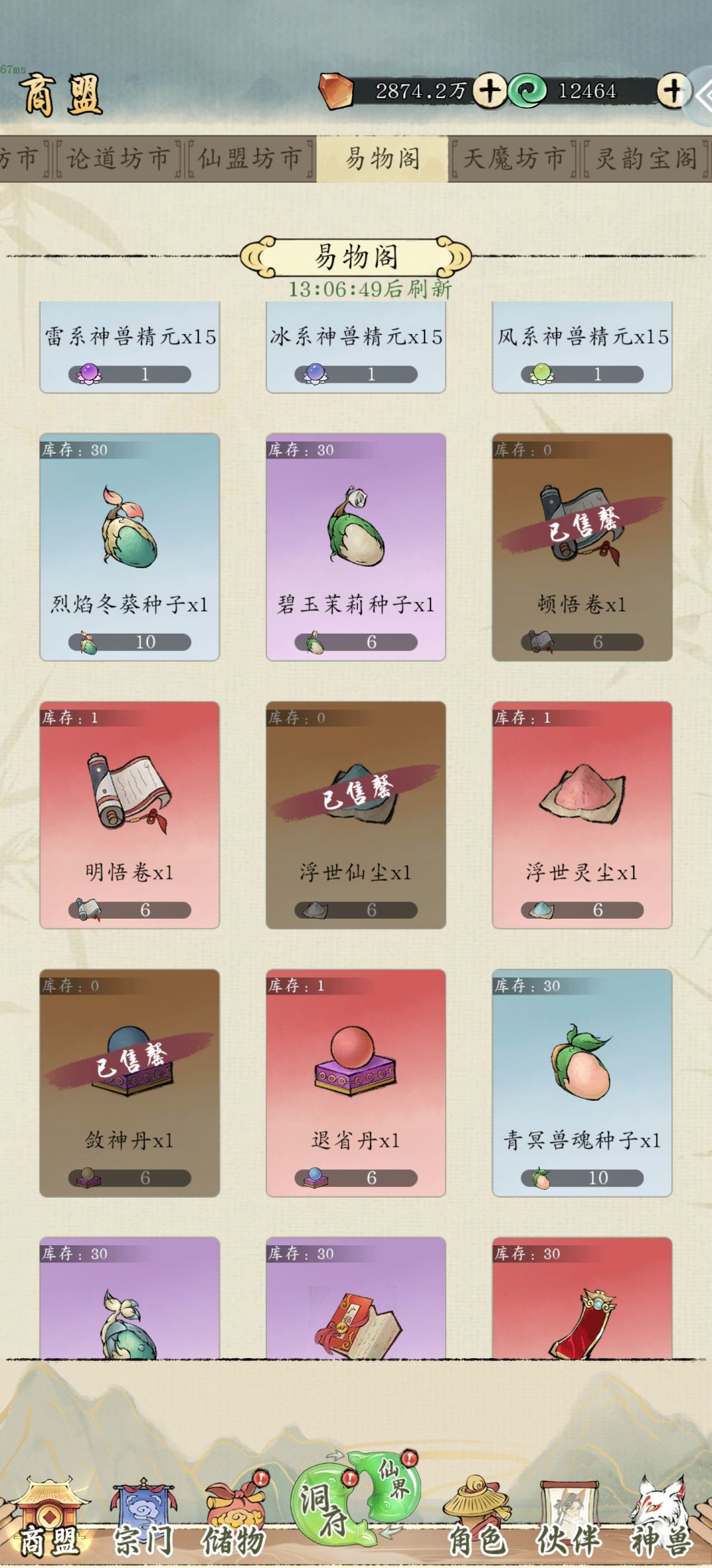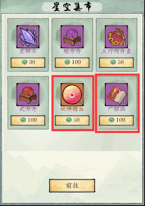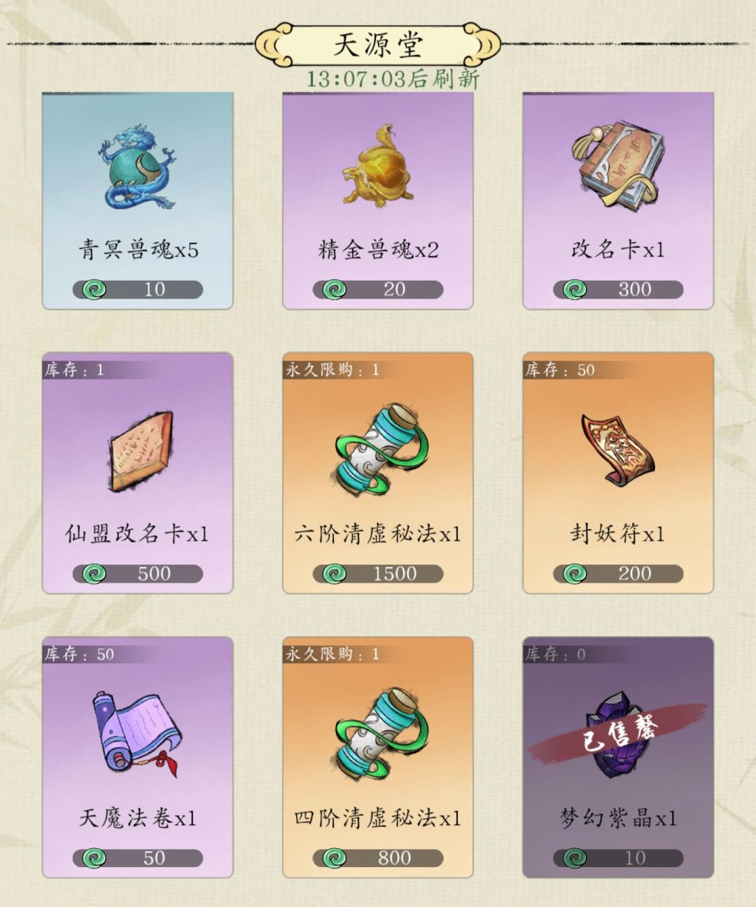 小商店(星空集市):一二层各有一个,买妖神精血(平均一周6-8个),仙玉充足的朋友,前期可以把100玉一个的招募令也买了,比直接用玉招弟子便宜50%