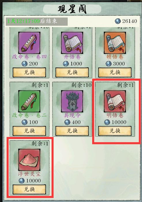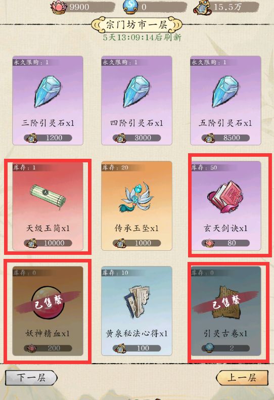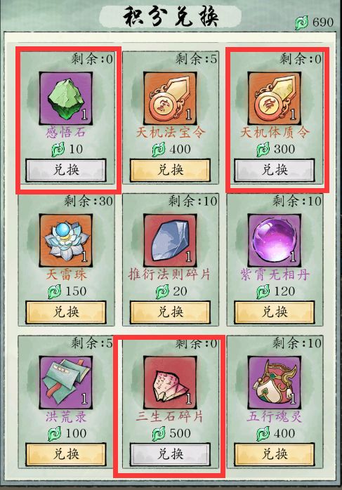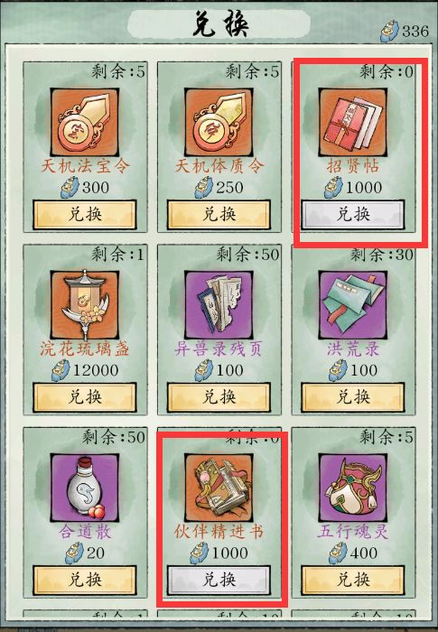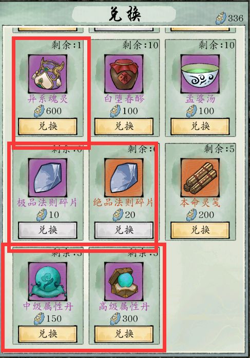 招贤贴、道侣精进书、异系魂灵、绝品法则、极品法则、高级属性丹、中级属性丹。(前期记得优先每周把合道散拉满),剩下的看自己意愿。比如体质令、或者周常被红尘问心卡住任务,买买酒也行。