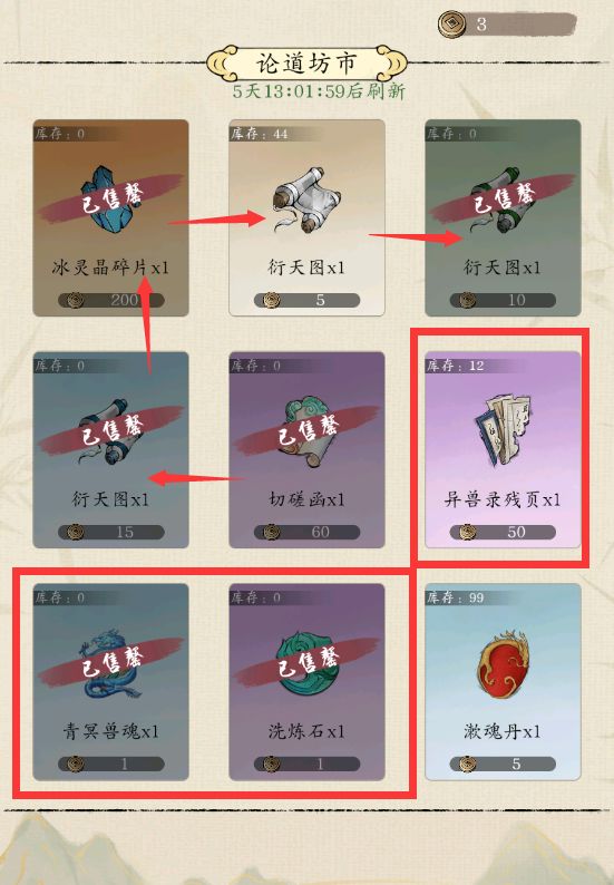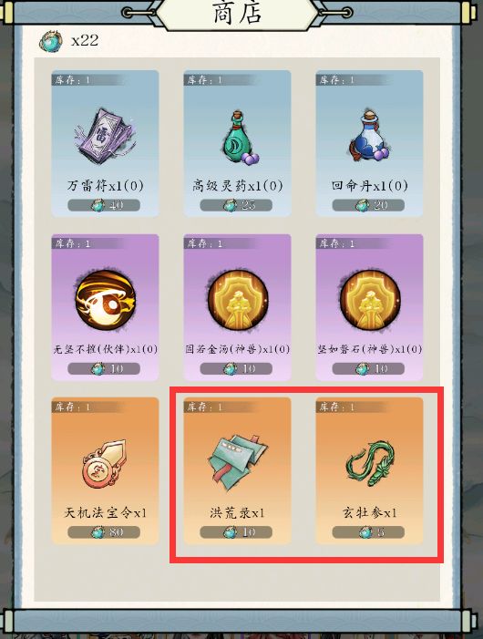 前期换洪荒录、玄牡参和鎏金御灵丹,洪荒录的主要来源,中后期珠子用不完时候,最下面一排无脑清空(神兽突破化形二阶,一个神兽需要100个化形丹,所以化形丹能买也买)。