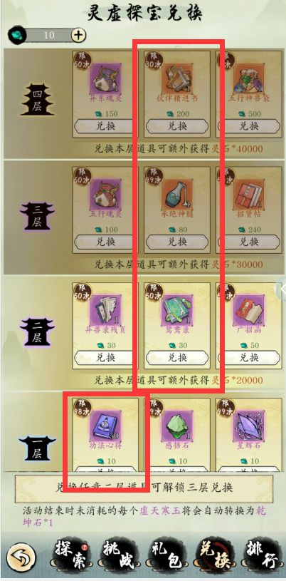 第一排换功法心得或者感悟石都行,后面换鸳鸯录、承绝神髓(便宜,而且打开后面一层),再换伙伴精进书。(建议优先换这几个。其他东西也可以换,比如招贤贴就差一、两张就能换红弟子了,那就换。比如积分不多,后面几层换不了,就全换鸳鸯录。前期积分多,而橙色伙伴少,也可以换点三生石碎片,具体情况根据自己资源而定)
