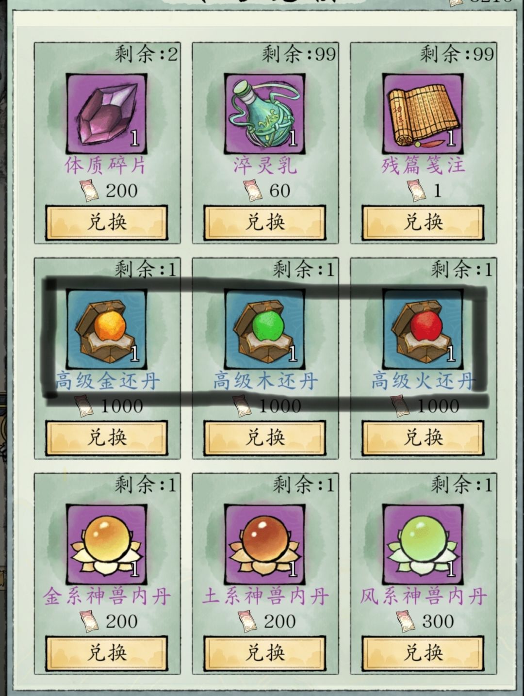 异兽蛋必买,破境丹、残篇、体质碎片有多余的也买,淬灵乳前期可以买点,记得留点金券,以防第二天刷好东西没钱买。当大乘,总体战力2.4亿后,每天1500金券,金券会慢慢逐渐积累,这时候商店会有高级神兽属性丹、鎏金御灵丹,可以直接买,兽潮商店是后期高级属性丹主要来源之一。(我神兽满丹药,主要靠的就是兽潮和跑商)