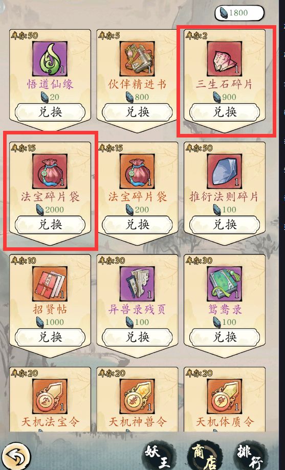 优先红色法宝碎片(前期橙色伙伴差太多,可以优先换三生石碎片,根据自己现阶段所缺的资源决定),其他缺啥换啥(大佬随意)。