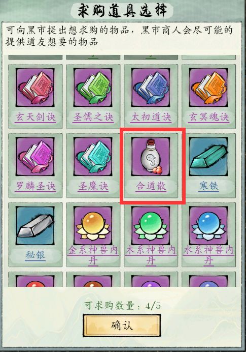 前期只买合道散,灵石充足后,传承书也买,传承满级后,买加好感的种子(这三个加好感的种子只要灵石,而木灵花、珊瑚草和混元果要玉,别点错了),如果绛云丹不够,也可以黑市求购一些。