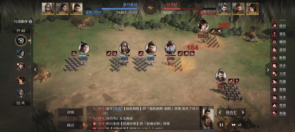 言到此处,自然就得把本文的特别鸣谢对象给带出来了。这个游戏ID名为“星月童话”的玩家朋友,在世界公共频道里分享了一套别出心裁的打法。他选取了周瑜、鲁肃和徐盛凑成一队,将曹操、典韦和黄月英构成的变种虎卫击败。值得注意的是,典韦是最早被击溃的,他全场也被压制得很惨,伤害总量勉强破万,对于典韦这样类型的打手来说,如此表现实在太伤自尊了。周瑜和鲁肃这两个儒将是如何联手把古之恶来给收拾得没脾气的,接下来就进入分析环节。