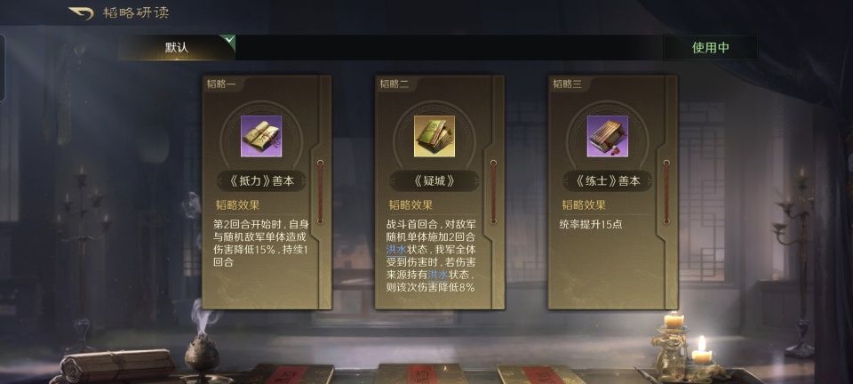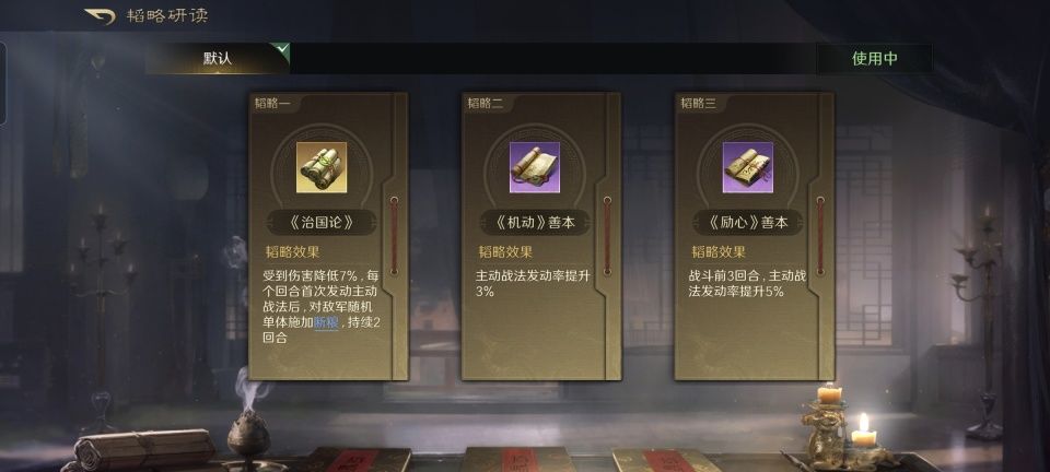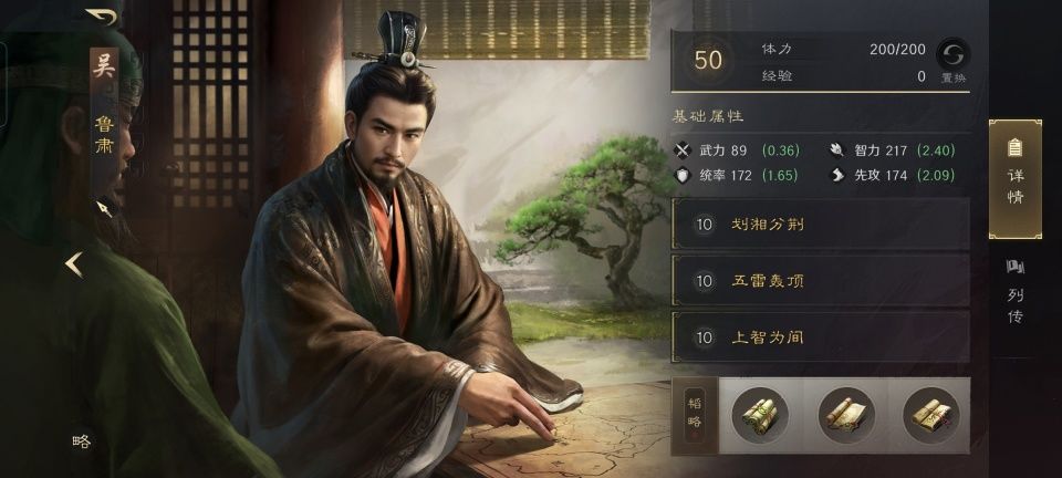 鲁肃在此战的韬略库是最赋有心机的,治国论的断粮效果能够削弱对面曹操和黄月英的治疗力度,机动和励心的善本可以在战斗的前三回合最多提升8%的主动战法发动率。照这么计算的话,鲁肃划湘分荆战法前三回合的发动率可以最高达到53%,五雷轰顶的发动率可以最高达到58%,上智为间的发动率最高也可以达到53%。