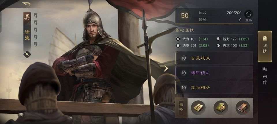 徐盛兜底的队伍,自然是摆出箕形阵迎战的。身处前排打掩护的徐盛,在配置上兼顾了防守和医疗。第二和第三战法,分别是铸甲销戈和忘私相助,韬略库由抵力善本、金书疑城和练士善本构成。